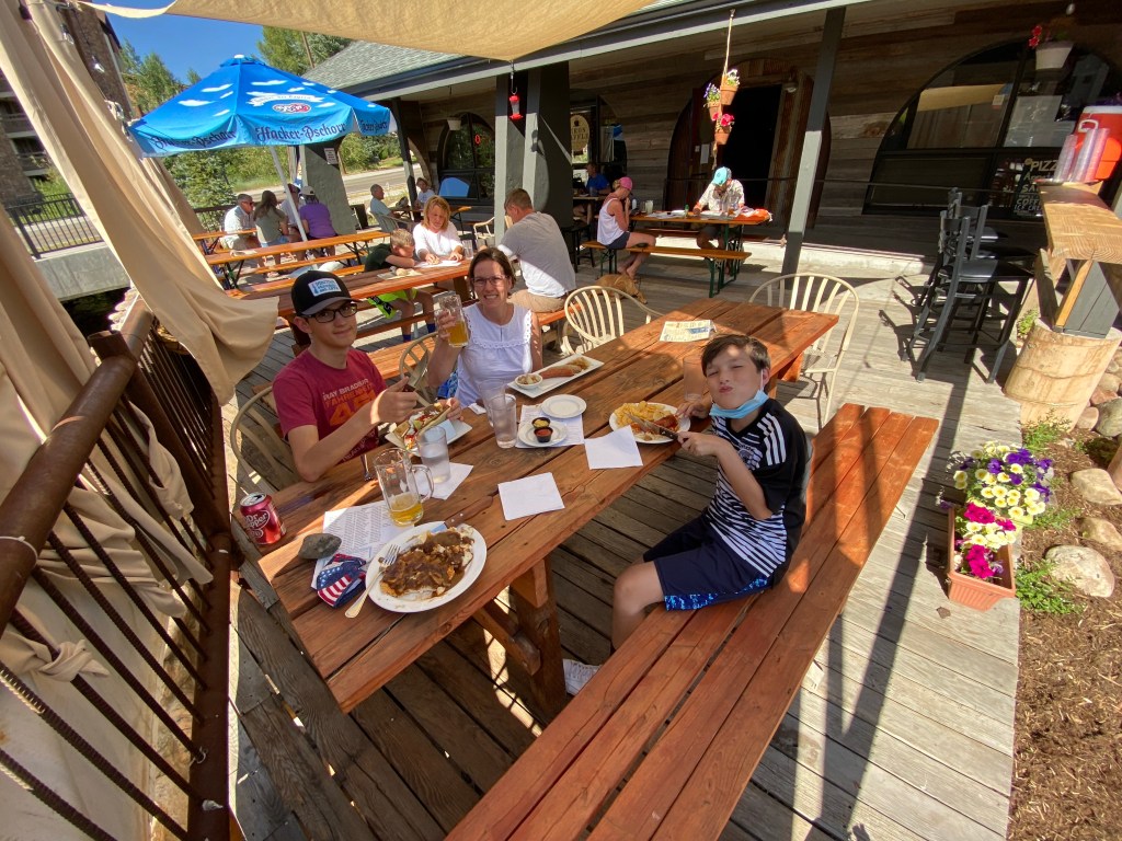 The morning drive though the Rocky Mountain national park to Grand Lake was beautiful, as expected. Outside the park, the scenery from Granby to Kremmling was ho-hum—we concluded that Colorado has plenty of ugly scenery, in between the well-known spots. Steamboat Springs was a welcome return to natural beauty and civilization. Really well-appointed hotel/town with all the amenities, including pool and hot tub. We celebrated our arrival with a dip and a trip to a Biergarten at the foot of the ski hill. We concluded the day by chilling out with Seinfeld’s Netflix special. All in all a relaxing, recharging kind of day.